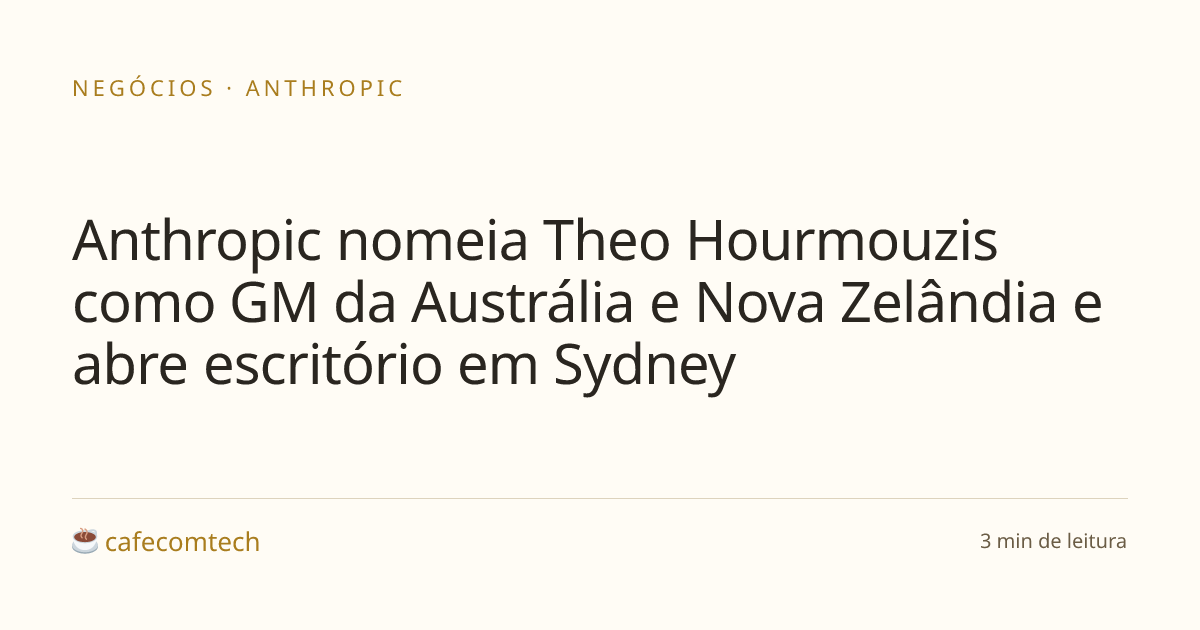A Anthropic abriu oficialmente escritório em Sydney e colocou Theo Hourmouzis como General Manager pra Austrália e Nova Zelândia. Ele vem da Snowflake, onde tocava ANZ e ASEAN. O movimento entra na sequência de Tóquio e Bengaluru, com Seul logo atrás, e chega junto com parcerias com Canva, Xero, Commonwealth Bank e Quantium.