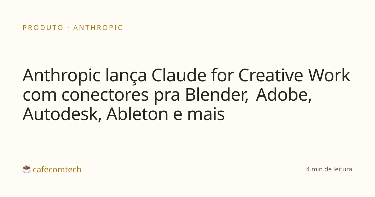 A Anthropic anunciou o Claude for Creative Work, uma leva de conectores construídos com Blender, Autodesk, Adobe, Ableton e Splice pra deixar o Claude rodar lado a lado com o software que time criativo já usa.