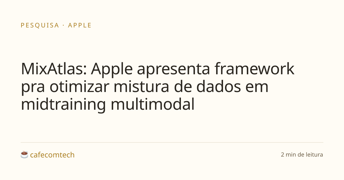Pesquisadores da Apple (com Virginia Tech e University of Washington) publicaram o MixAtlas, framework pra otimizar mistura de dados em treinamento multimodal de LLMs. Usa modelos proxy menores e processo gaussiano pra explorar o espaço de mistura a 1/100 do custo do treino full-scale. Resultado: convergência até 3x mais rápida e ganhos de 2-5% em benchmarks, com +10% em ChartQA e +13% em TextVQA. Aceito no workshop NADPFM do ICLR 2026.