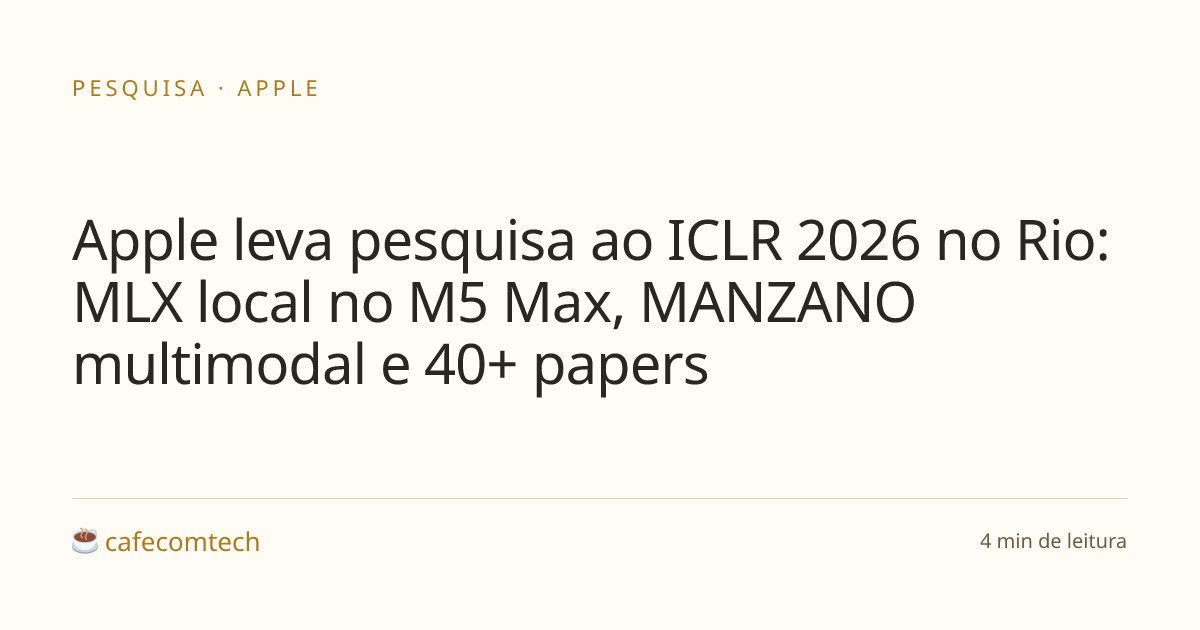 A Apple desembarca no Rio de Janeiro pra edição 2026 do ICLR (International Conference on Learning Representations), de 23 a 27 de abril, com mais de 40 papers na conferência principal, workshops e duas demos técnicas no estande 204: inferência de LLM local num MacBook Pro M5 Max rodando MLX dentro do Xcode, e o SHARP gerando nuvem de pontos 3D num iPad Pro M5.