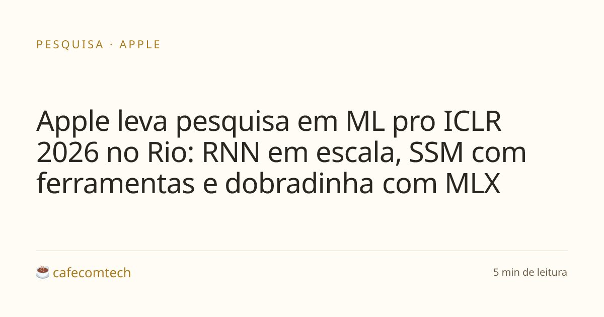 A Apple desembarca no ICLR 2026, que rola no Rio de Janeiro, com cinco trabalhos de destaque: paralelização de RNNs que destrava treino de 7B parâmetros, uso de ferramentas externas pra State Space Models generalizarem em tarefas longas, modelo multimodal unificado (Manzano), geração 3D a partir de uma foto em menos de 1 segundo (SHARP) e uma nova arquitetura simples pra protein folding (SimpleFold).