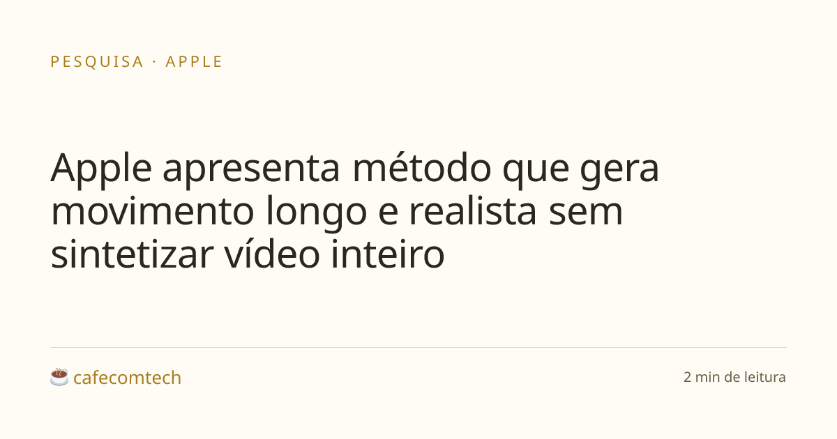 Pesquisadores da Apple e do CompVis (LMU Munique) publicaram no CVPR 2026 um paper que modela dinâmica de cena operando direto num embedding de movimento de longo prazo, em vez de gerar vídeo frame a frame. Compressão temporal de 64x e um modelo de flow-matching condicional entregam geração de movimento orientada por texto ou 'pokes' espaciais, superando modelos de vídeo SOTA e abordagens especializadas.