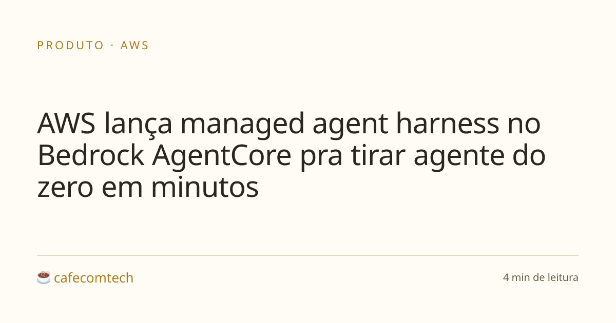 A AWS anunciou novos recursos no Amazon Bedrock AgentCore pra encurtar o caminho entre ideia e agente rodando. O destaque é o managed agent harness: você declara o agente em 3 chamadas de API, sem código de orquestração. Também entrou uma CLI que cobre prototipagem, deploy e operação no mesmo terminal, além de skills pré-construídas pra assistentes de código como Claude Code, Kiro, Codex e Cursor.