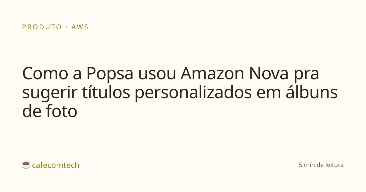 A Popsa, empresa de álbuns de foto que opera em 50+ países e 12 idiomas, trocou seu algoritmo baseado em grafo por uma stack de Amazon Bedrock com Claude 3 Haiku e depois Amazon Nova pra gerar títulos e subtítulos. Resultado: feedback positivo subiu de 58% pra 73%, custo caiu, latência caiu 35% com ConverseStream API, e o feature gerou 5,5 milhões de títulos em 2025.