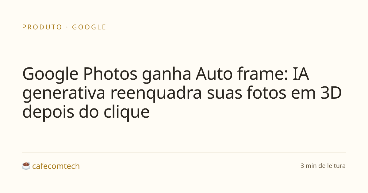 Tá live no Google Photos como parte do Auto frame. Fotos elegíveis que contêm pessoas passam pelo pipeline, e a versão reenquadrada aparece como segunda opção dentro dos candidatos do Auto frame. Um toque e tá aplicado.