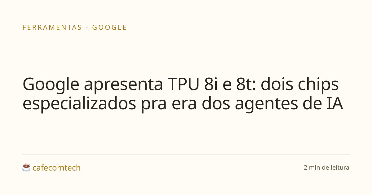 O Google anunciou a oitava geração do TPU com dois chips dedicados: o TPU 8i, otimizado pra inferência de agentes de IA autônomos que executam workflows multi-etapas, e o TPU 8t, voltado pra treinar modelos complexos num único pool gigante de memória. A dupla vira o motor da stack full-stack do Google pra escalar IA agêntica.
