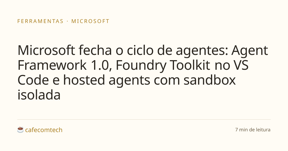 A Microsoft lançou a v1.0 do Agent Framework (SDK open-source que unifica Semantic Kernel e AutoGen em Python e .NET) junto com GA do Foundry Toolkit pro VS Code, memory gerenciada, Toolbox com MCP/OpenAPI/A2A num endpoint só, hosted agents com sandbox isolada e cold-start abaixo de 100ms, e Observability full GA no Foundry Control Plane. A pegada: cobrir o ciclo do laptop à produção sem você juntar peça de três fornecedores.