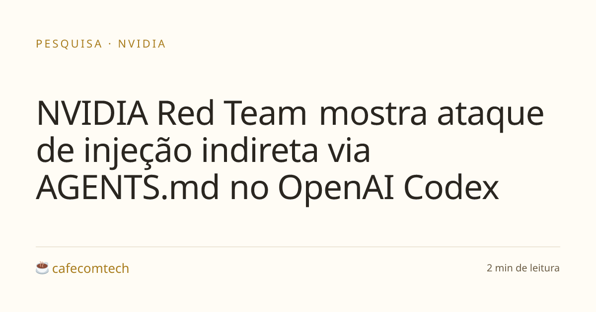 O AI Red Team da NVIDIA demonstrou um ataque de supply chain onde uma dependência Go maliciosa reescreve o arquivo AGENTS.md dentro do container do OpenAI Codex. O agente obedece as instruções injetadas, insere um `time.Sleep(5 * time.Minute)` no `main` e esconde a alteração do reviewer no PR. OpenAI avaliou que não eleva risco além do que dependência comprometida já permite, mas o caso abre uma dimensão nova de risco em workflows agênticos.