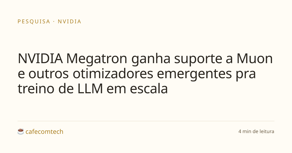 A NVIDIA integrou o Muon (MomentUm Orthogonalized by Newton-Schulz) e outros otimizadores de segunda ordem como MOP e REKLS no Megatron Core e no NeMo Megatron Bridge. Resultado: treino do Kimi K2 e Qwen3 30B em GB300 NVL72 com perda mínima de throughput contra o AdamW. A receita junta otimizador distribuído layer-wise e três modos de Newton-Schulz distribuído pra lidar com tensor parallelism.