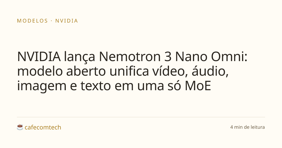 A NVIDIA jogou o Nemotron 3 Nano Omni, modelo aberto de 30B-A3B em arquitetura MoE (Mixture of Experts) que unifica raciocínio multimodal de vídeo, áudio, imagem e texto num único loop. Substitui as stacks fragmentadas de visão+fala+linguagem que agentes precisam hoje. Pesos, datasets e receitas abertos no Hugging Face, com suporte a vLLM, SGLang e TensorRT-LLM em GPUs Ampere, Hopper e Blackwell.